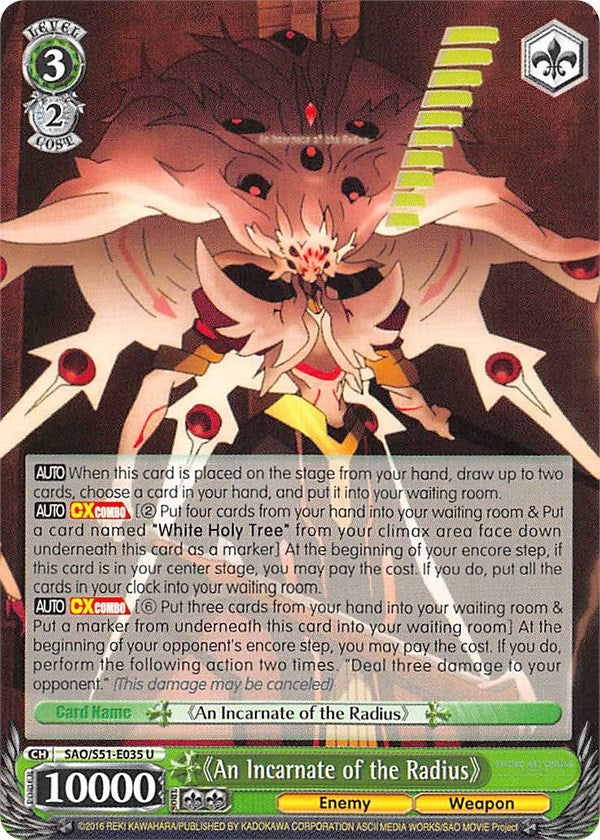 [AUTO] When this card is placed on the stage from your hand, draw up to two cards, choose a card in your hand, and put it into your waiting room. [AUTO][CXCombo][(2) Put four cards from your hand into your waiting room & Put a card named "White Holy Tree" from your climax area face down underneath this card as a marker] At the beginning of your encore step, if this card is in your center stage, you may pay the cost. If you do, put all the cards in your clock into your waiting room. [AUTO][CXCombo][(6) Put three cards from your hand into your waiting room & Put a marker from underneath this card into your waiting room] At the beginning of your opponent's encore step, you may pay the cost. If you do, perform the following action two times. "Deal three damage to your opponent." (This damage may be canceled)