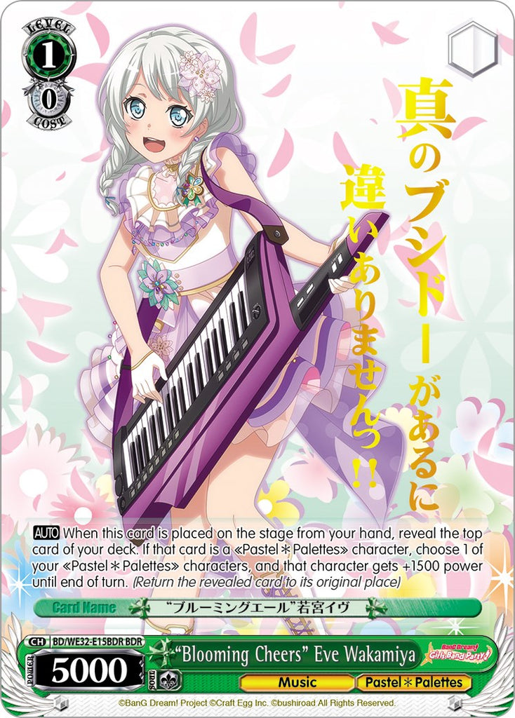 [AUTO] When this card is placed on the stage from your hand, reveal the top card of your deck. If that card is a "Pastel*Palettes" character, choose 1 of your "Pastel*Palettes" characters, and that character gets +1500 power until end of turn. (Return the revealed card to its original place)