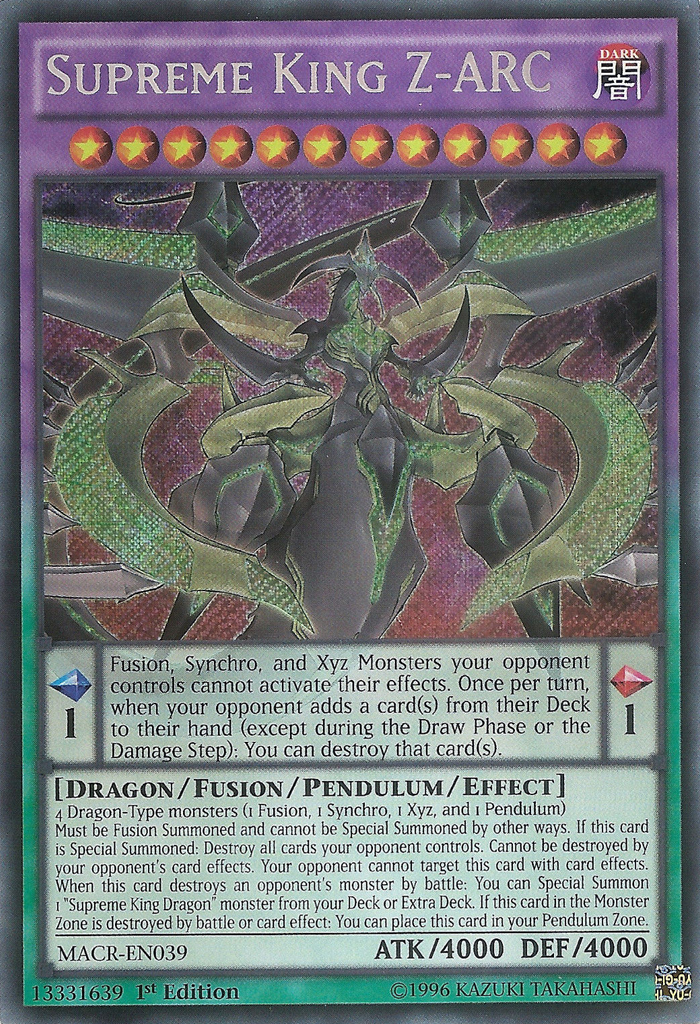 Must be Fusion Summoned and cannot be Special Summoned by other ways. If this card is Special Summoned: Destroy all cards your opponent controls. Cannot be destroyed by your opponent's card effects. Your opponent cannot target this card with card effects. When this card destroys an opponent's monster by battle: You can Special Summon 1 "Supreme King Dragon" monster from your Deck or Extra Deck. If this card in the Monster Zone is destroyed by battle or card effect: You can place this card in your Pendulum Zone.
